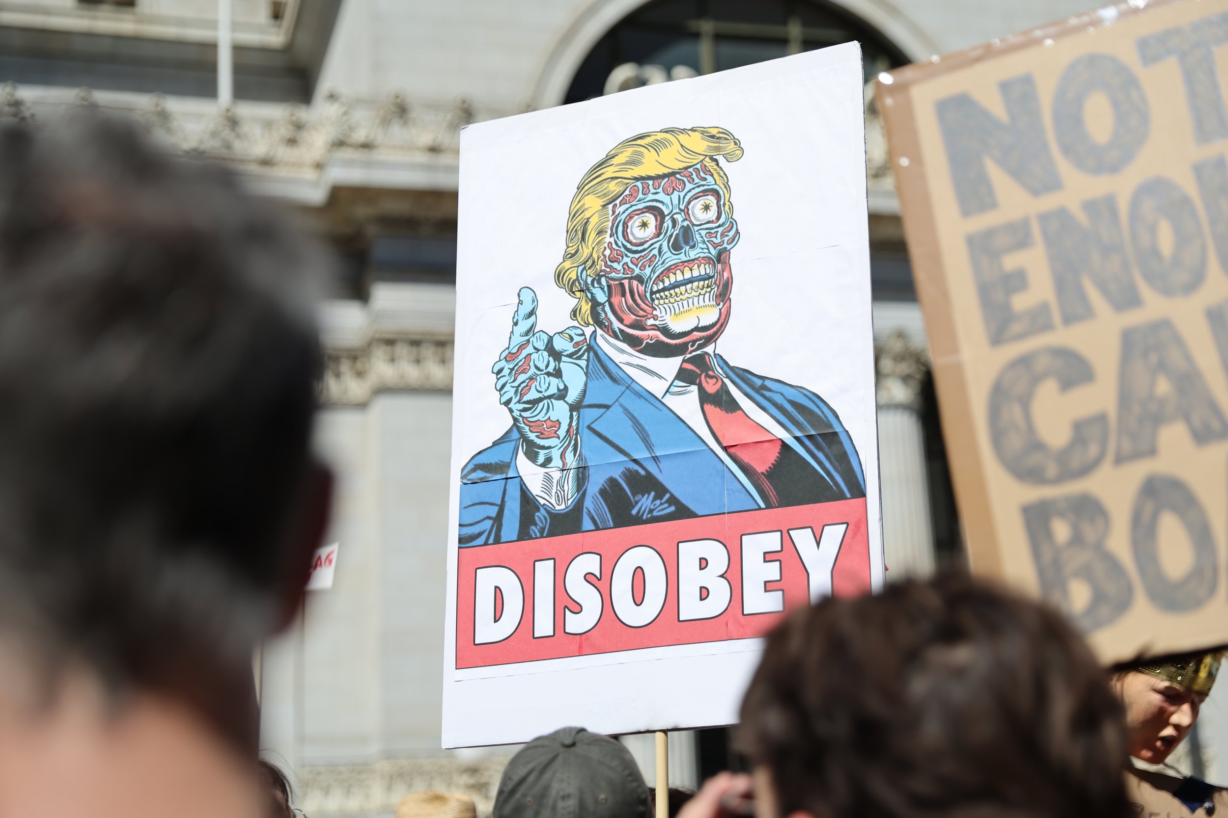 “Disobey”—A protester’s sign offered a pointed instruction as the crowd moved through the streets on the largest single-day demonstration in United States history.