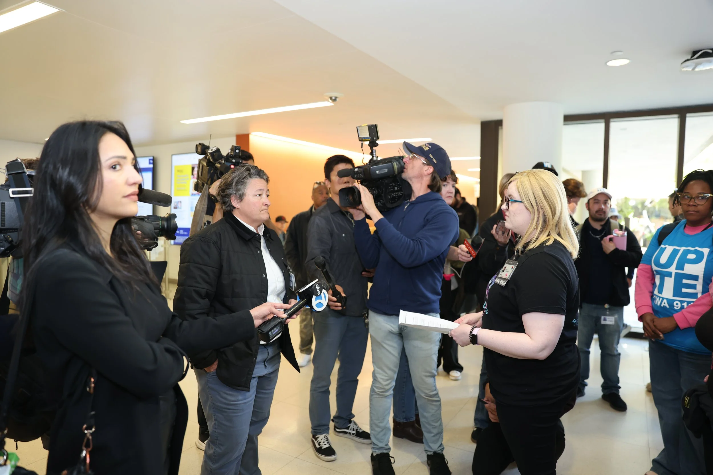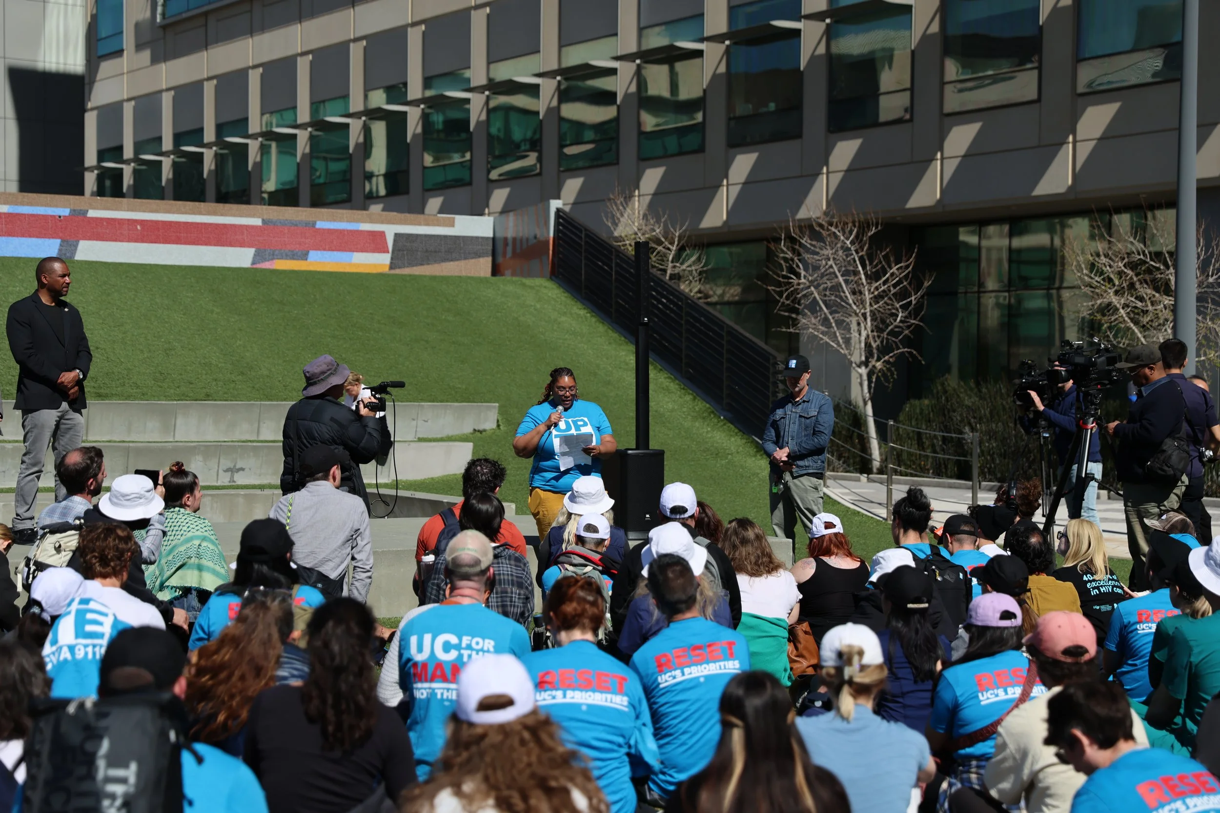 I photographed a rally at UCSF Medical Center at Mission Bay, where social workers and more than two hundred members of University Professional and Technical Employees Communications Workers of America Local 9119 (UPTE CWA 9119) demanded real safety protections from the University of California. The rally came two months after the fatal stabbing of UC social worker and UPTE member Alberto Rangel, and amid survey data showing 90 percent of UCSF campus social workers have faced physical, sexual, or verbal assault or threats on the job. Workers rallied, then marched on the boss to deliver a letter of demands to Chancellor Sam Hawgood’s office, calling on UC to implement common-sense safety measures, increase staffing, and end a two-tiered pay system that drives turnover and puts workers, patients, and communities at risk.