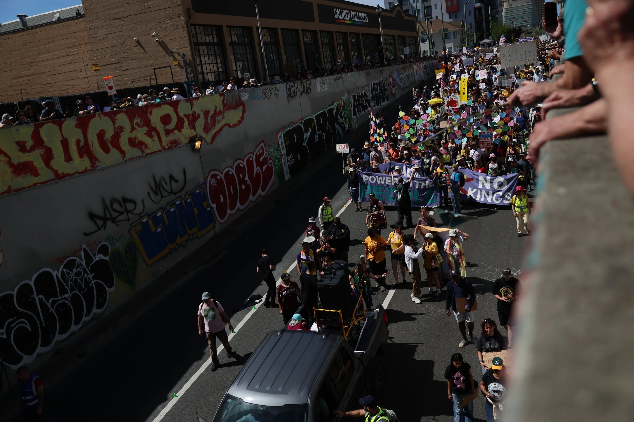 The march moved under an overpass as thousands of Oakland demonstrators made their way from Frank Ogawa Plaza to Lake Merritt, one of more than 3,300 No Kings events held across all fifty states on March 28.